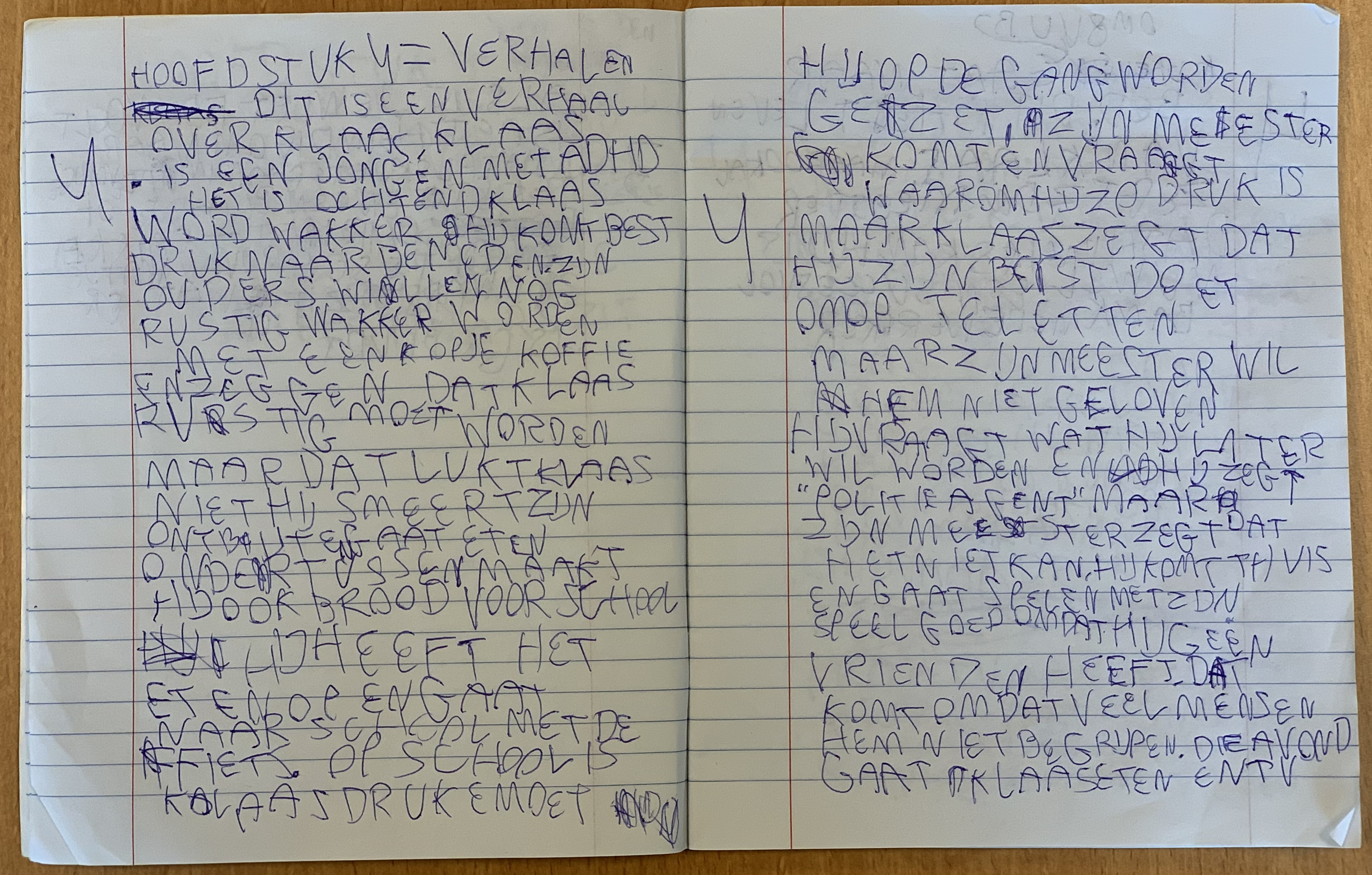 24 februari 2021"Dit is een verhaal over Klaas, Klaas is een jongen met ADHD het is ochtend Klaas wordt wakker. Hij komt best druk naar beneden zijn ouders willen nog rustig wakker worden met een kopje koffie en zeggen dat Klaas rustig moet worden maar dat lukt Klaas niet hij smeert zijn ontbijt en gaat eten ondertussen maakt hij ook brood voor school hij heeft het eten op en gaat naar school met de fiets. Op school is Klaas druk en moet hij op de gang worden gezet. Zijn meester komt en vraagt waarom hij zo druk is maar Klaas zegt dat hij zijn best doet om op te letten maar zijn meester wil hem niet geloven hij vraagt wat hij later wil worden en hij zegt “politieagent” maar zijn meester zegt dat het niet kan. Hij komt thuis en gaat spelen met zijn speelgoed omdat hij geen vrienden heeft. Dat komt omdat veel mensen hem niet begrijpen. Die avond gaat Klaas eten en tv kijken. Om 8 uur gaat hij naar bed. Dit is het leven van Klaas, maar ook al zegt zijn meester dat hij niks kan, hij is nu wel een succesvol bankmedewerker."